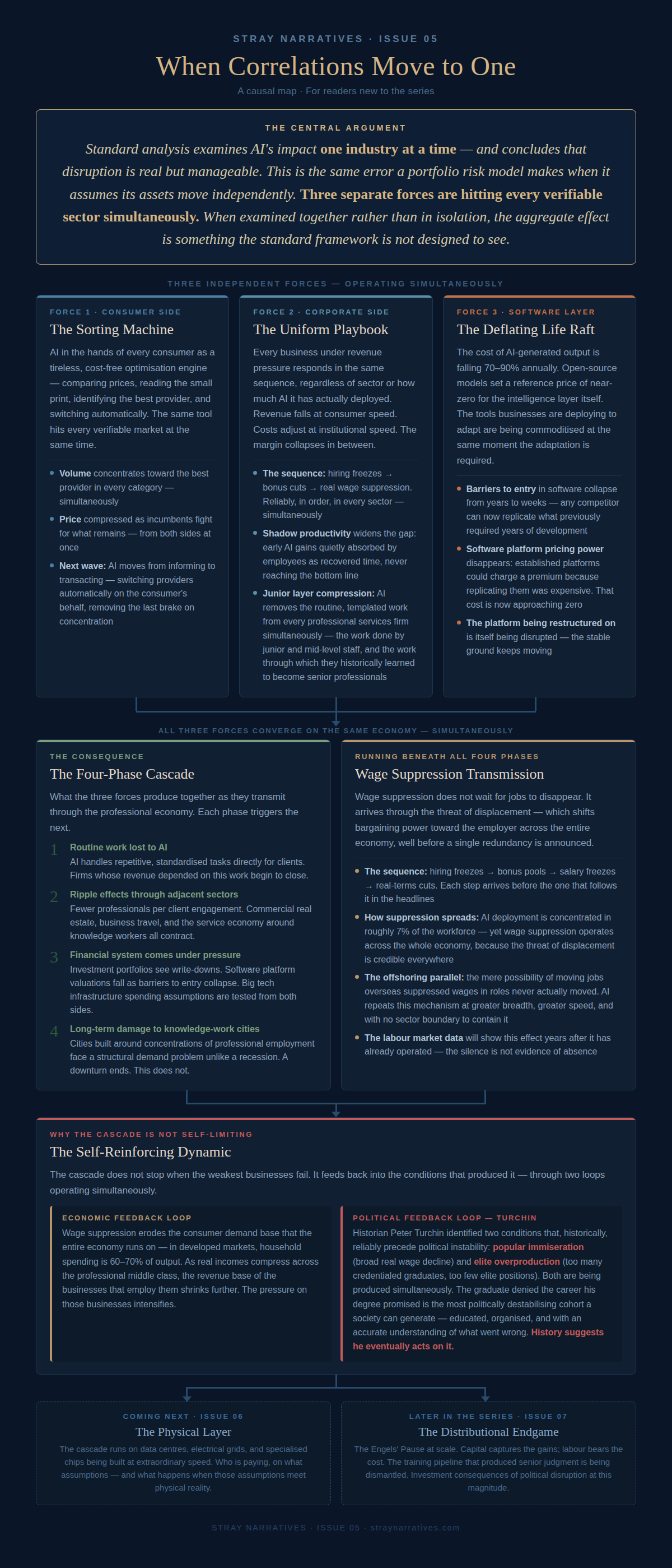 To understand what the combined effect of these forces produces when it runs its course, Andrea Pignataro’s analysis of the cascade mechanism is worth deploying in full [3]. I have held it until this point in the series because it requires both correlation structures, and the software layer dynamic, to be properly understood before it reads as a sequence rather than a list.